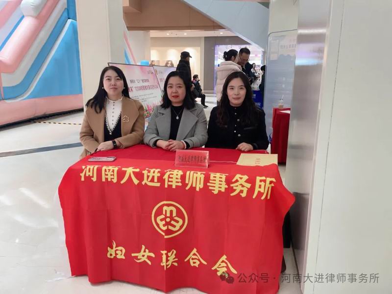 3月7日,在“三八”国际妇女节来临之际,洛阳市2025年“三八”妇女维权周普法暨义诊公益活动在中州万达广场举行。河南大进律师事务所积极响应号召,派出卢娉、任芳芳、尚艳艳等骨干律师组成专业服务团队,为市民提供免费法律咨询,用专业知识守护民生权益,传递法治温度。