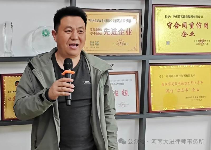 普法大讲堂承办方中州环艺建设集团副总经理李国战代表企业家们表达心声:感谢省建设文化协会洛阳分会、大进律所在他们公司开设普法大讲堂。他分享经验说,中州环艺建设集团拥有建筑幕墙工程、建筑装饰装修工程专业承包壹级及建筑工程施工、市政公用工程施工总承包贰级,消防设施工程、防水防腐保温工程、建筑机电安装工程、钢结构工程、古建筑工程专业承包贰级等多项资质,且能成为AAA级资信企业和信用企业、诚信供应商、诚信经营示范单位,并成为重合同、重服务、重质量守信用企业,获全国装饰工程优质工程奖、省先进企业、省建筑装饰装修行业诚信企业家等诸多殊荣,这离不开企业重合同守信用、合规经营。