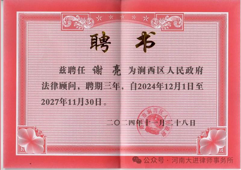 11月29日,洛阳市涧西区人民政府举行第一届政府法律顾问聘任仪式,我所谢亮、高晓军、梁玉三位律师被聘任为涧西区人民政府法律顾问。