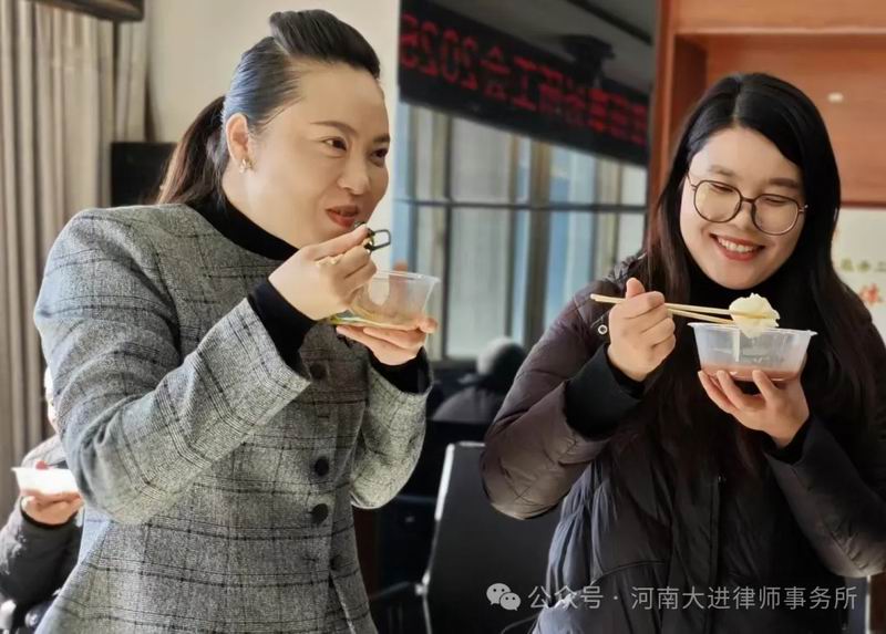 由于律所喝腊八粥活动年年搞,参加活动的律所同仁对这种集体过节习以为常,他们像在自己家过节一样喜笑颜开,一个个显得十分惬意。吃一口香气扑鼻、味道浓郁的道口烧鸡,品尝着外皮柔软,内馅鲜美的可口香包,喝着粥香四溢,口感滑嫩的腊八粥,置身其乐融融、欢乐祥和的集体活动现场,脸上洋溢着幸福的笑容。大进女律师方菁平、薛帅琳喜笑颜开,她们认为,生活需要仪式感,律所坚持集体过腊八节,不仅是为了让美食丰富味蕾,更是为了在数九寒冬让大家感受大家庭的温暖。这种暖心活动彰显了大进律所“家文化”魅力。