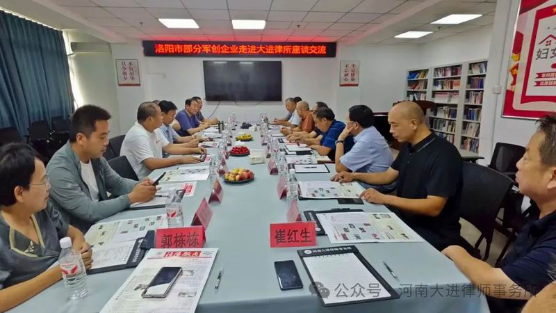 8月14日,洛阳市关爱退役军人就业创业促进会党支部书记、会长张永森,“全国模范退役军人”、洛成退役军人服务协会会长郭武军,以及洛阳市部分军创企业负责人共13人,共同走进河南大进律师事务所参观、交流、座谈。