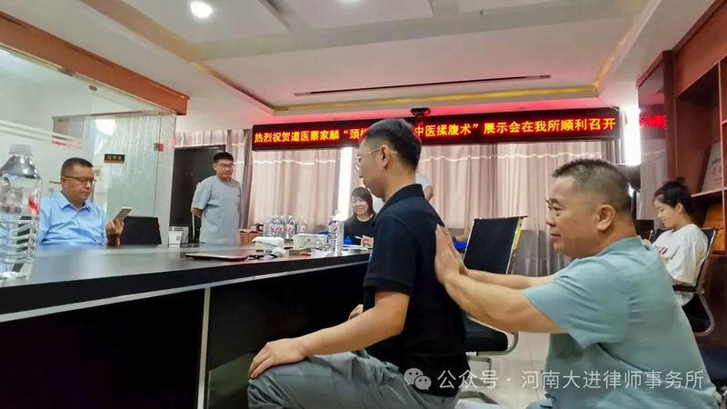 当天下午,蔡家麟、陈思带领市健管协道医专业委人员,向大进律所律师们展示了把脉义诊、针灸、治疗颈椎病和偏头痛、中医揉腹等专业医术,为律所人员提供沉浸式体验服务约30人次。