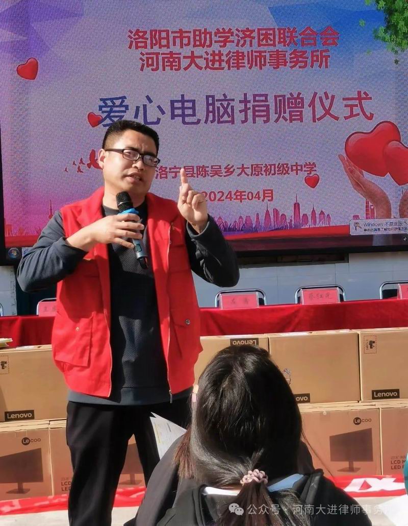 “乐善有恒,大爱无疆。”4月12日,洛阳市助学济困联合会携手大进律师事务所走进洛宁县陈吴乡大原初级中学,为该校捐赠价值6万元的联想牌崭新电脑20台,解决了学校教学中缺少电脑的燃眉之急。