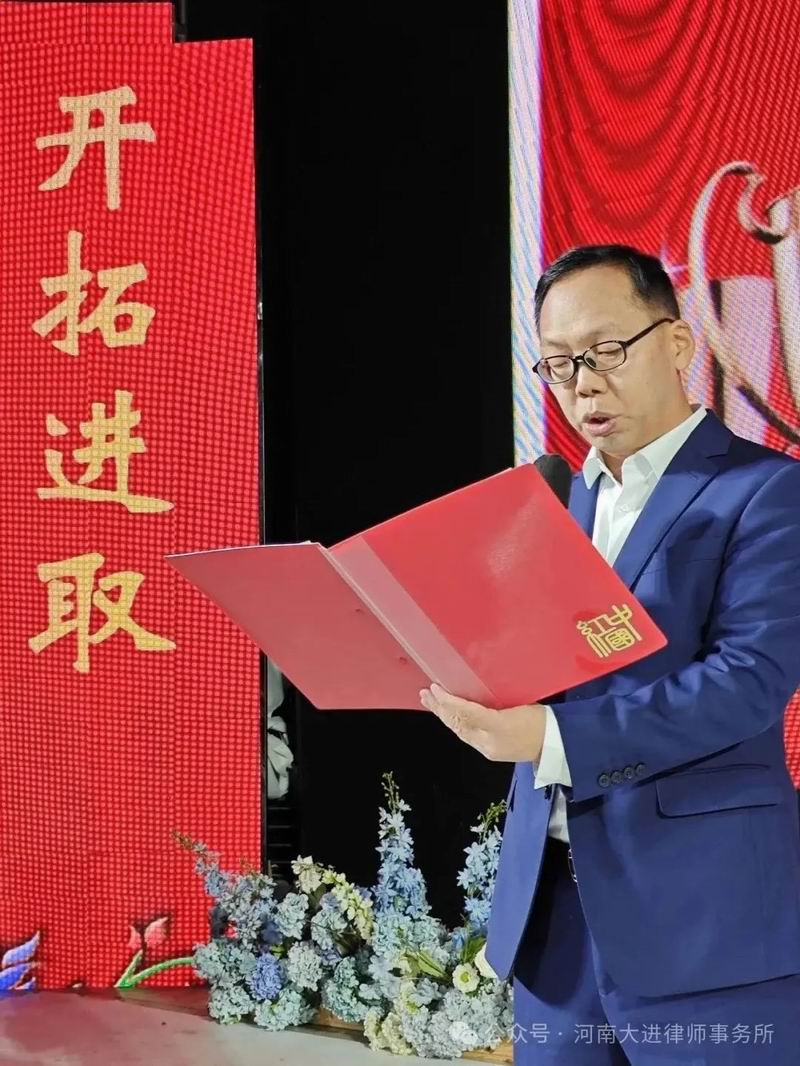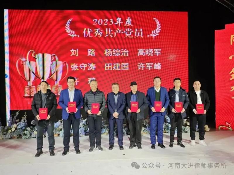 大进律所工会主席、合伙人、副主任谢亮宣读了《中共河南大进律师事务所支部委员会关于表彰2023年度优秀共产党员、群团先进个人的决定》:刘路、杨综治、高晓军、田建国、张守涛、许军峰、许璐获律所优秀党员荣誉,张爱峰获律所优秀工会干部荣誉,许现伟获律所优秀工会标兵荣誉,刘卫莉获律所优秀工会积极分子荣誉,孟进获律所优秀妇联标兵荣誉,白卡卡获律所优秀妇联积极分子荣誉,白鸽获律所优秀团务干部荣誉,卢鑫、高亚鹏、曹瑞丹获律所优秀团员荣誉。