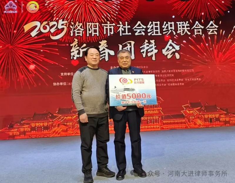 会上表彰了市社会组织联合会2025年度优秀团队及先进个人,公布了3个“特别贡献奖”获得者,我所党支部书记、主任左鑫金榜题名,洛阳市社会组织联合会会长汤占军为左鑫主任颁奖——奖励赴日本豪华游轮五日游。事后,左鑫主任将这个大奖用于大进律所年会现场抽奖,结果该大奖最终“花落”我所实习律师霍晓玲。