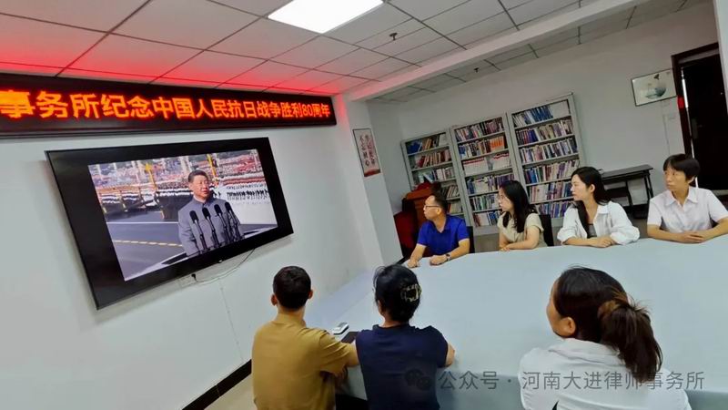 山河铭记峥嵘,岁月镌刻荣光。9月3日上午,纪念中国人民抗日战争暨世界反法西斯战争胜利80周年大会在北京天安门广场隆重举行。河南大进律师事务所组织在所律师及实习律师集中收看了央视直播,共同见证这一具有重大历史意义的时刻。