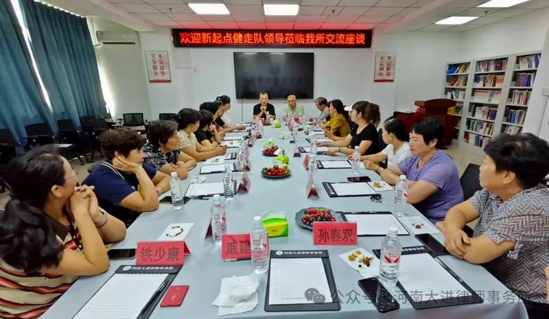 9月1日上午,洛阳新起点健走总队队长左文亮、副总队长许春益、郭建会、王敏携各分队队长等一行20人,到访河南大进律师事务所。大进律所党支部书记、主任左鑫代表律所热情接待,双方围绕健步走运动对促进“身心健康、快乐生活”的积极意义展开了广泛而深入的对话。
