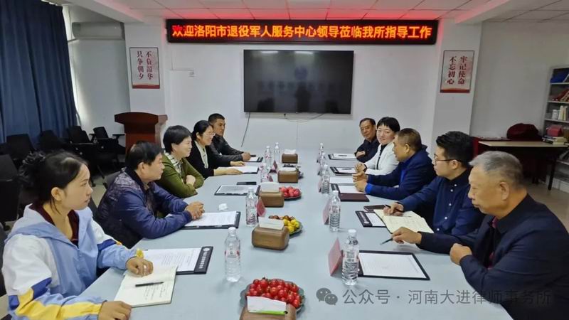 9月22日上午,洛阳市退役军人服务中心党支部书记、主任严华,副主任张卫东、就业创业服务科科长杨冰梅等一行莅临河南大进律师事务所,就进一步做好退役军人公益法律服务工作进行座谈交流,并对大进律所及张守涛律师此前提供的专业法律服务支持表示衷心感谢。我所党支部书记、主任左鑫,执行主任刘路,副主任高晓军、余丹,品牌总监罗晓,律师张守涛等参与座谈。